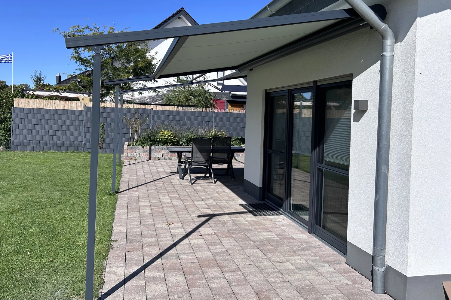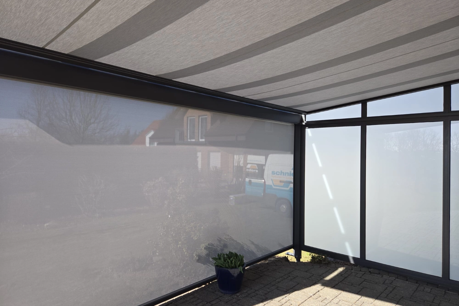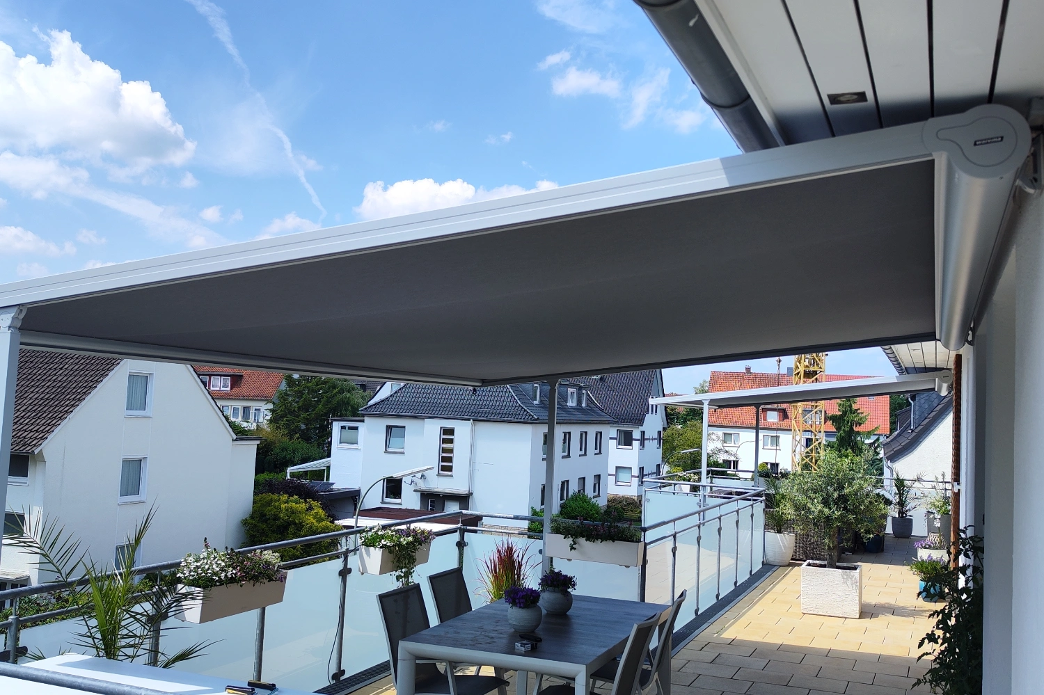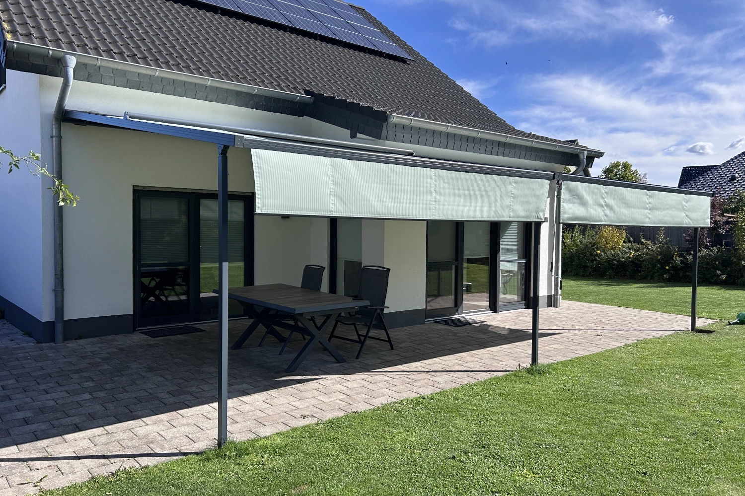 Terrassendach Q100 von Erhardt in Melle – kombiniert mit zwei markilux 779 Unterglasmarkisen mit tracfix-System.