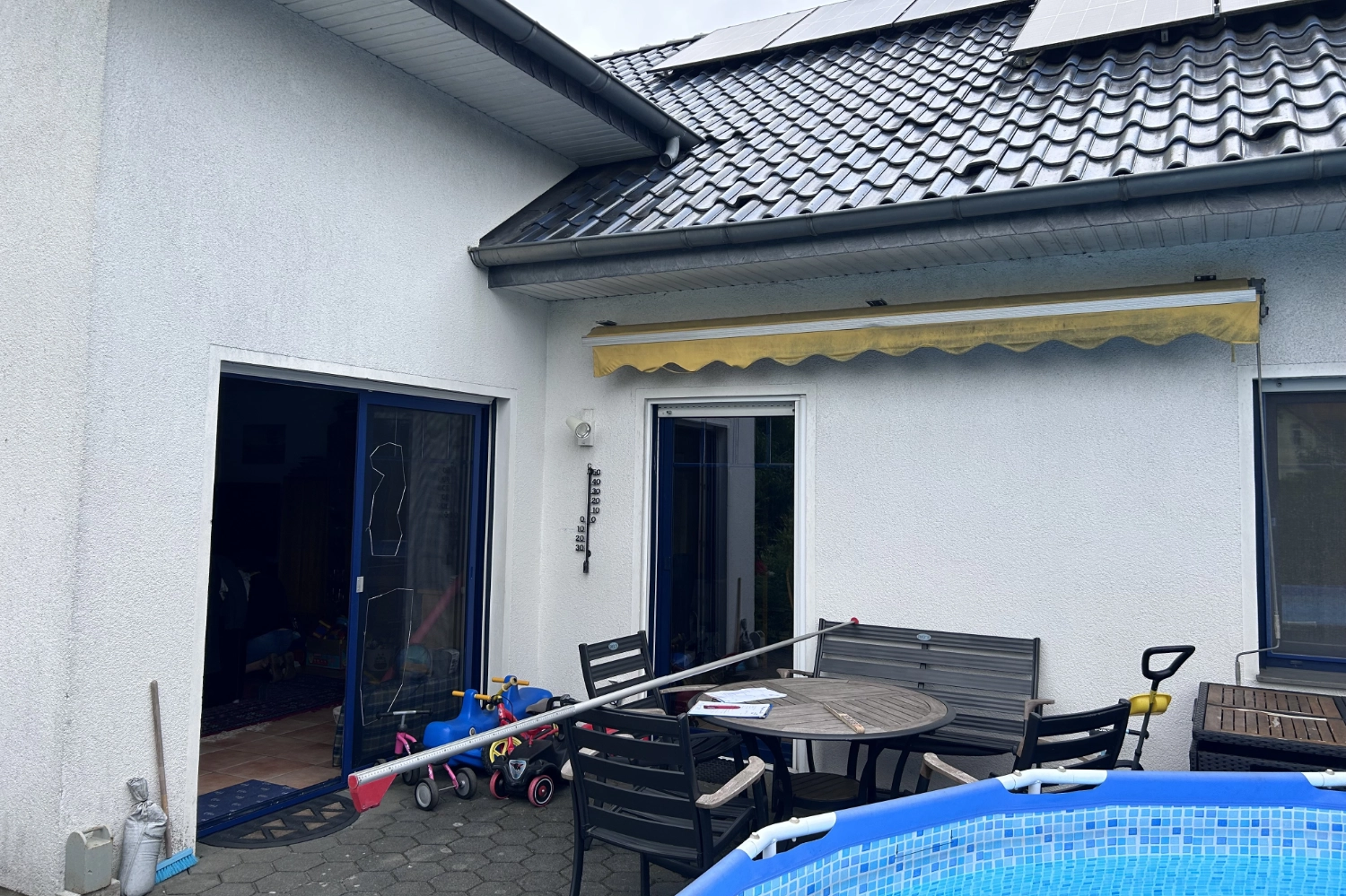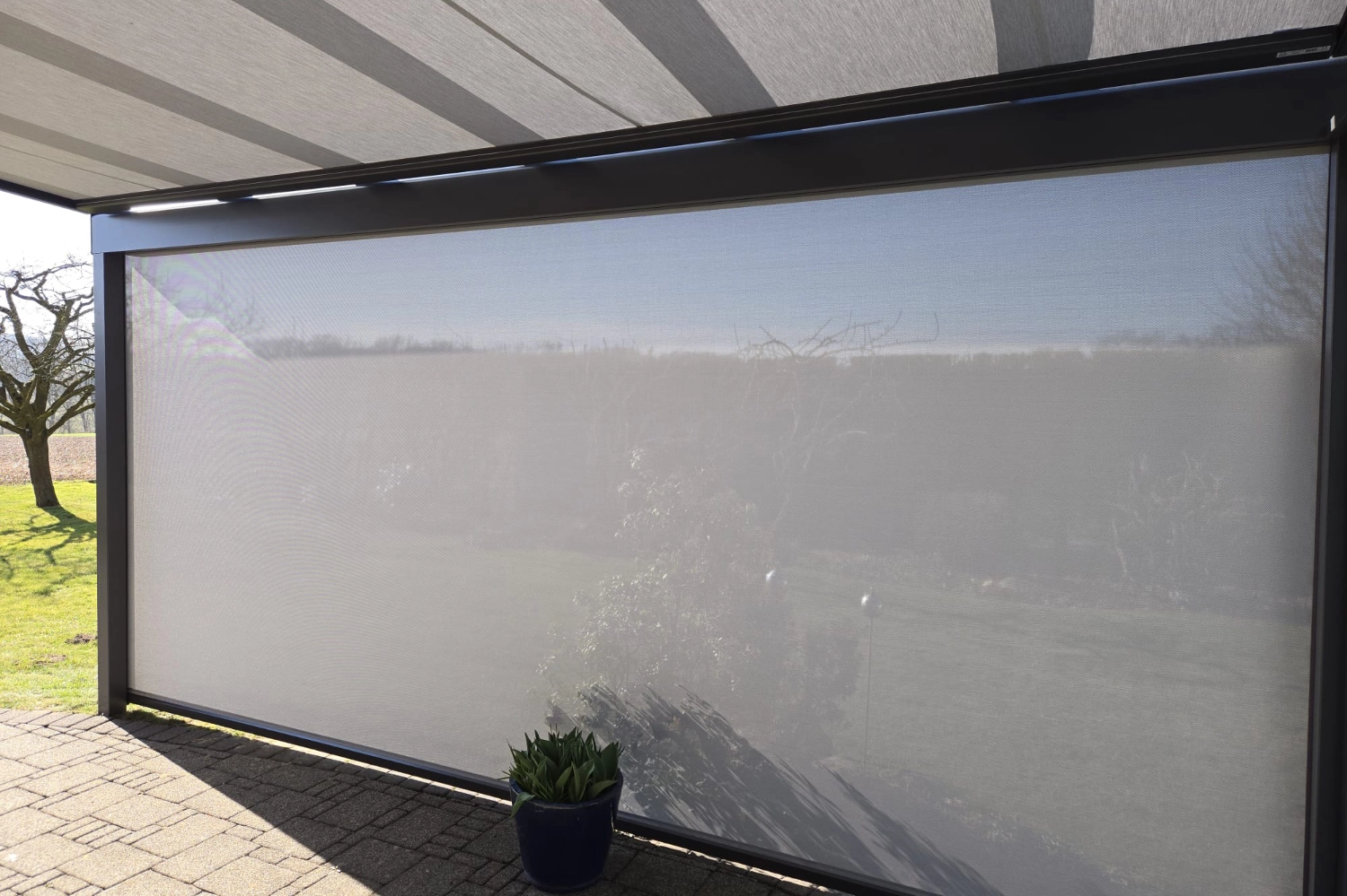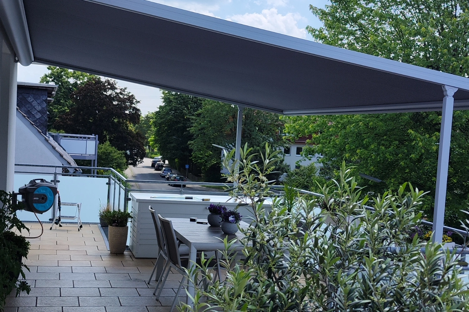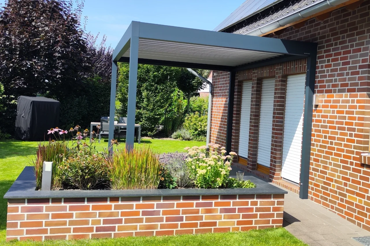 Terrassendach Q100 von Erhardt in Melle – kombiniert mit zwei markilux 779 Unterglasmarkisen mit tracfix-System.